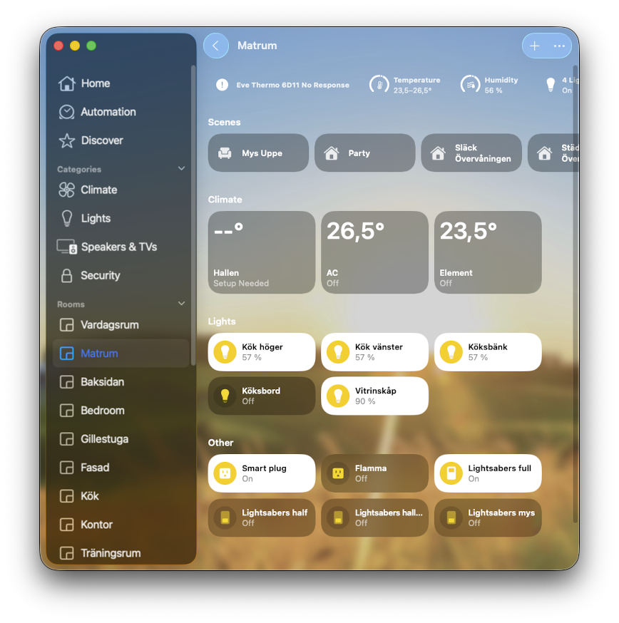 Huvuddelen är att jag kan styra dem via Home-appen, som ni ser så har jag fyra inställningar, full, half, mys och halloween för olika inställningar.