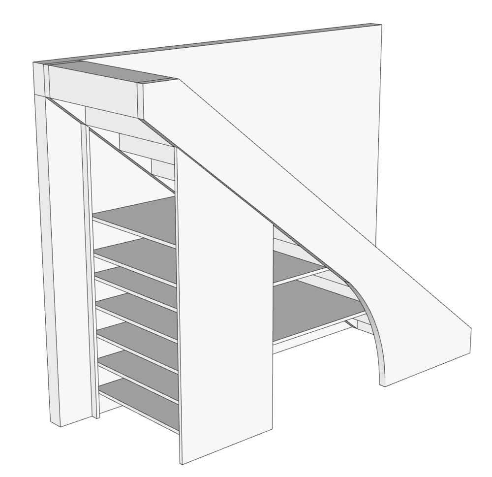 En trappa är ju rätt smidig för att ta sig till från en våning till en annan. Rutschkana är ju nice, men svår åt ena hållet. Så trappan får bli kvar. Men utrymmet under trappan är ju ibland riktigt drygt. Det är en så underlig form så ordentlig förvaring kan vara riktigt klurigt.