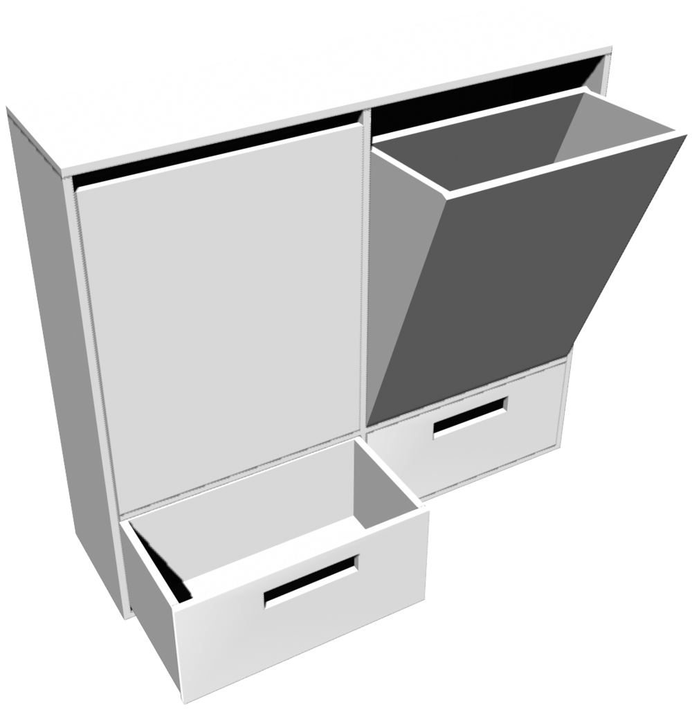 Men idén är bra, och det vore nice med en möbel som tar mindre plats i groventrén så jag designade om den igen. Den här gången med lådor som alla vinklas ut, och plats för alla olika typer av återvinning.