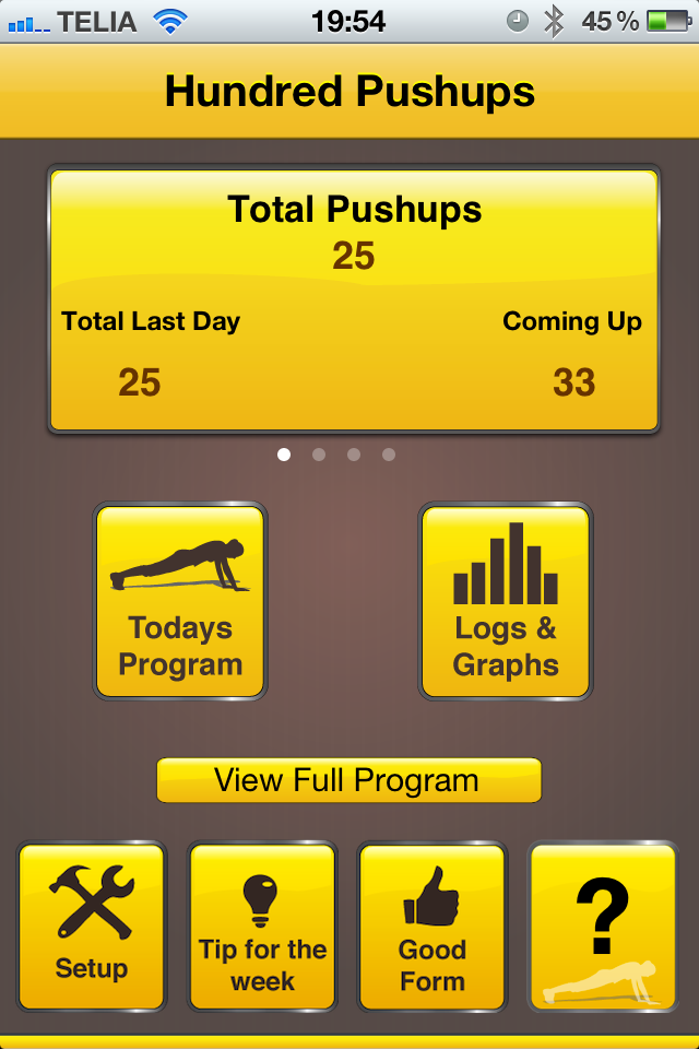 Två andra iPhone-apps är dess som ger en ett program för hur man ska göra armhävningar och situps tre gånger i veckan. En typisk morgonaktivitet helt enkelt. För varje gång så ökar den mängden repetitioner. För varje pass gör man till exempel 10 armhävningar, vila 60 sekunder, 13, vila, 13, vila, 10, vila, 12. Ska bli intressant och se hur det ska fungera och vav resultatet blir. Jag ska ta lite före/efter-foton också förstås.