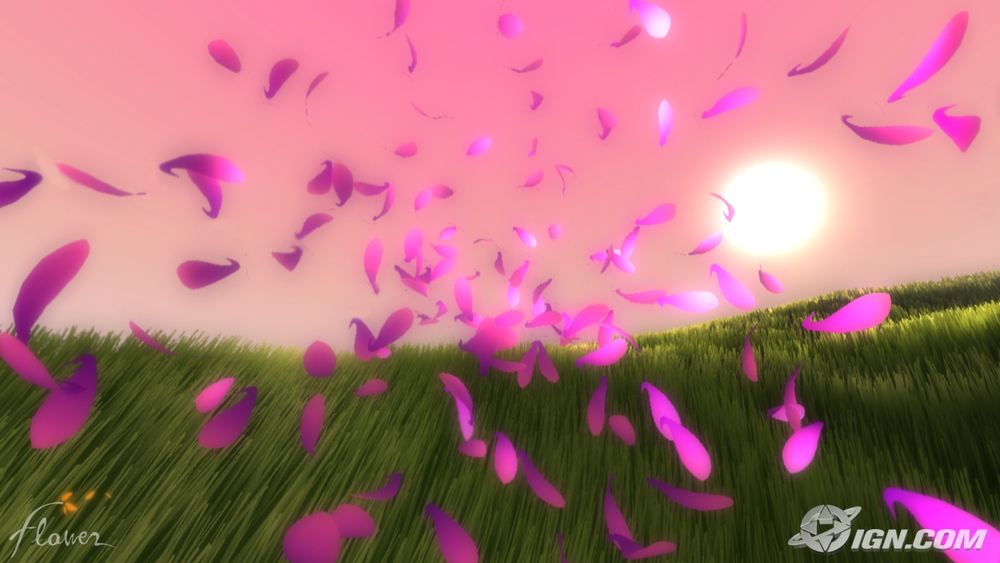 Som de flesta vet så har jag en förkärlek för vackra spel. Jag har tyvärr inte spelat Okami vilket ska vara väldigt vackert, men jag har ju spelat alla Mystspel och även senaste Prince of Persia är ju obeskrivligt vackert. Men jag tror nog Flower slår dem allihop. Det är så otroligt vackert så man mår bra bara av grafiken. Det är ett så himla enkelt spel, om det ens bör kallas spel. Du spelar som "vinden" - det vill säga att du styr blomblad i vinden, när du far förbi en blomma så plockar du upp fler blomblad och ska så åka över ängarna och "väcka" naturen eller världen. När du plockat upp blomblad från en klunga med blommor så kan resultatet att grönt gräs väller ut runt den punkten.