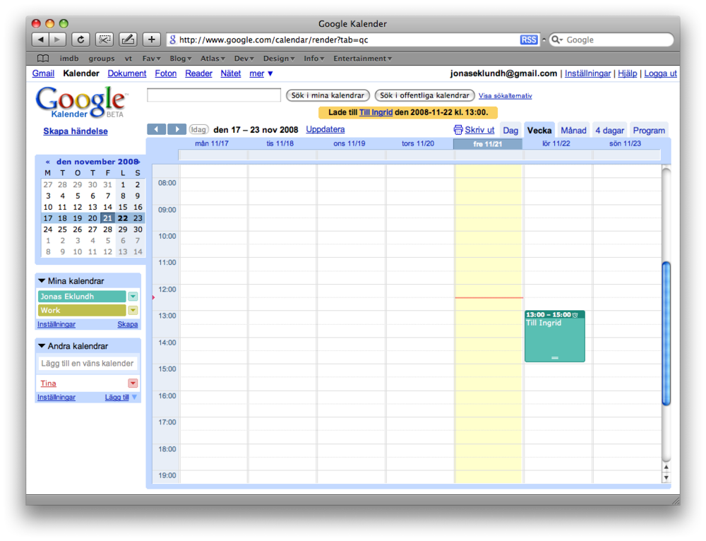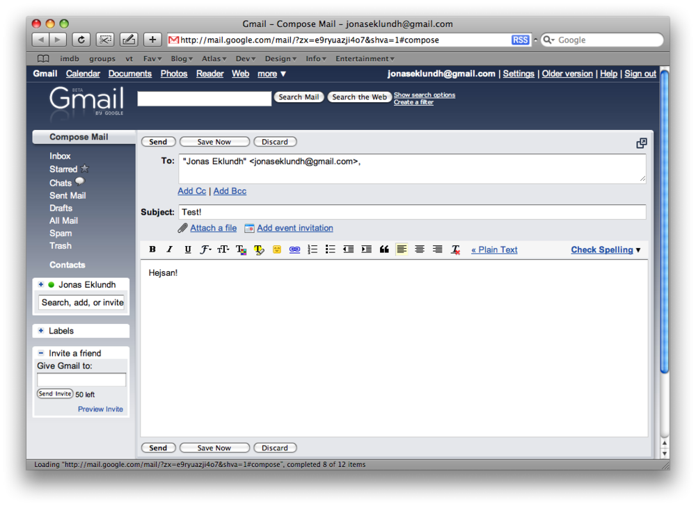 Google lanserade nyligen "themes" för Gmail så man kan förändra utseendet, och det blev genast bättre, även om det inte direkt blev bra. Jag valde det temat som såg mest ut som en riktigt applikation (Shiny) och sen jämförde jag lite mellan Google och Mobile Me. Men innan jag börjar så vill jag nämna att jag är väl medveten om att Google applikationer i regel har mer funktioner än Apples. Men samtidigt så är det ju så att saker som att du kommer åt dina picasa-album från din google-blog jämförbart med att du lätt kommer åt dina iPhoto-bilder från iWeb. Men saker som grupp-kalendrar är sådant som saknas i Apples applikationer. Klicka på bilderna för att se dem i större storlek
