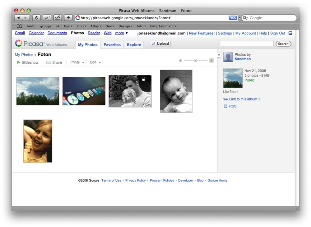 Detta var värt att nämna också - så här ser det ut när man laddar upp bilder i Picasa, det är fem åt gången som mest och man får välja varje en och en. Det finns givetvis desktop-applikationer för att ladda upp fler åt gången på ett smidigare sätt, men detta är alltså webgränssnittet. Det är ändå viktigt för det är via det här gränssnittet man laddar upp när man inte har desktop-applikationen tillgänglig. Hemma hos kompisar, på resan och så vidare.