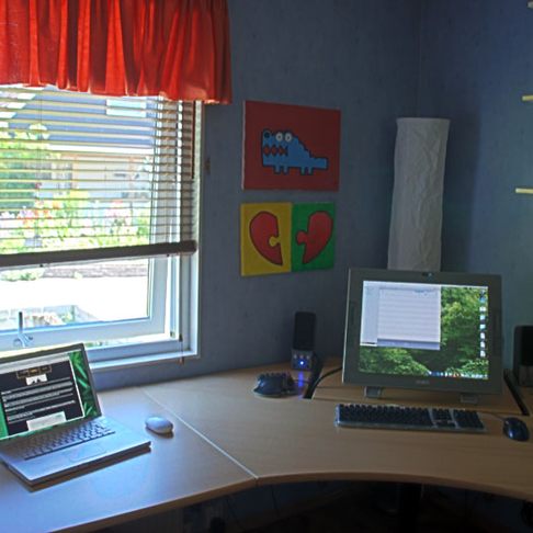 Sen använde jag en rad olika verktyg i Photoshop (mer om dessa senare) för att kombinera de tre ovanstående bilderna till en HDR-bild. Som ni ser så kan man se vad som finns utanför fönstret samtidigt som man kan se vad som är på skärmarna och även skuggområden blir bra.