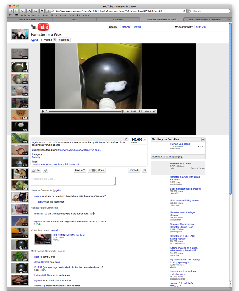 Tyvärr så buggar YouTube lite när man är med i HTML5-betan. Sidan ser ut som bilden här så fort jag rör musen över något element. Det har varit så här rätt länge nu och det verkar vara fler som har det problemet. Och buggen tycks inte vara relaterad till själva VIDEO-taggen heller. Det är lite störande. Tycker själva videotaggen inte fungerar helt hundra heller då jag inte kan klicka för att gå till ett speciellt ställe i videoströmmen. Det verkar som en typisk youtube-bugg detta för video i andra html5-implementationer verkar fungera som det ska.