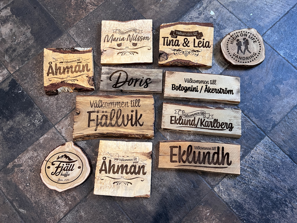 Skaffade en laserskärare för några månader sedan, och den kan ju även gravera, så kändes rätt så naturligt att det blir lite "Välkommen till"-skyltar till släkt och vänner som julklapp. Detta är de flesta, men kom på ett par till efter jag tog det här kortet