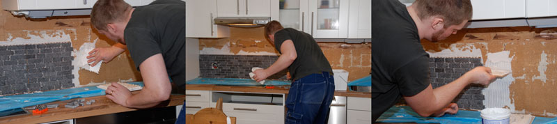 Jaaa, äntligen sitter det uppe! Ok, jag har inte fogat ännu, men det ska jag förmodligen göra i kväll. Men nu sitter kaklet där det ska i alla fall. Se vad jag jobbar och sliter. Och slit var det, att få på kakellimmet och få upp plattorna var verkligen skitjobbigt. Ok, jag har inte stans bästa kondition (risken är rätt överhängande att jag har stans sämsta, faktiskt) men det hela blev lite mer spännande när jag upptäckte att en kartong med kakel såg annorlunda ut. inte jätteolika, men ändå en tydlig skillnad i struktur när plattorna var bredvid varandra. Så det var bara att slita ned dem jag redan hade satt upp och limma kortväggen, där jag satte dem istället, och sen upp med dem där, såga till så dom passade, skynda skynda det torkar! Svettigt!