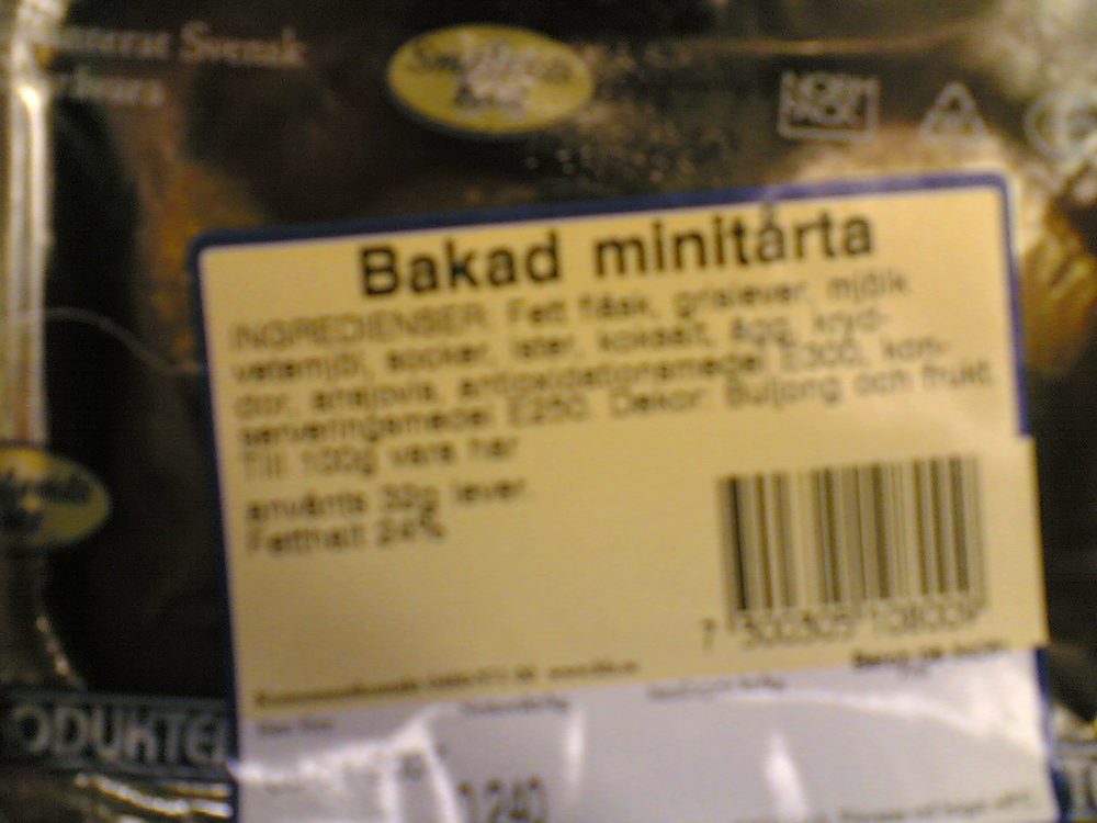 "Bakad minitårta" låter besynnerligt. Det som fanns i förpackningen såg ut som inlagda kronärtskockor eller nåt. Inte något jag vill ha mitt på bordet när jag fyller år, Tina!
