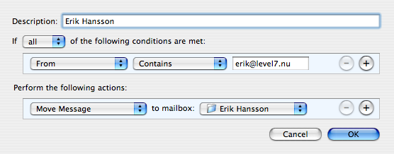 Så, de filter jag har är en för varje stadig kontakt (Hej igen Erik Hansson!) som automatiskt filtreras ned i en mapp och sparas. Detta är för kontakter vars mail jag i regel vill spara. Som till exempel från min mor, som hjälper mig med ekonomin. Sen är det saker som beställningar från nätet, som automatiskt sparas ned i en mapp, eller saker som inloggningsuppgifter till nättjänster.