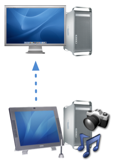 Så här ser det alltså ut nu. Jag har med mig laptoppen till jobbet, och sen via nätverket så streamar jag musiken från den till min jobb-Mac (via iTunes sharing) så jag kan lyssna på musiken direkt. Nackdelen med detta är att jag ju inte kan köpa eller lägga till musik via min jobb-Mac utan måste göra det via laptoppen. Samma sak med att skapa playlists och sådant. Det funkar, men det skulle kunna vara smidigare.