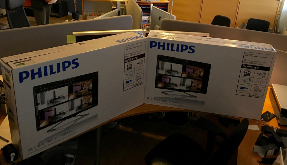 Kröp till korset och köpte två stycken 40-tum (!!) 4K-skärmar till jobbet. Varje är på 3840x2160, uppdaterat från mina gamla 30-tum 2560x1600-skärmar.