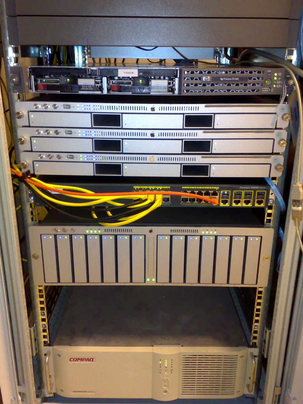 Jag kan låta meddela att en Xserve RAID med fjorton stycken 750GB-diskar i sig är mycket mycket tung. Men nu sitter den på plats och är ihopkopplad med en av Xservrarna med ett 4Gbit/s fiberkanalkort. Raid:en är inställd som två enheter på vardera 5TB. varje disk är en RAID5-array med sju diskar i varje. Min första tanke var att spegla dessa mot varandra men jag har ändrat mig och kommer istället köra backup från den ena till den andra.