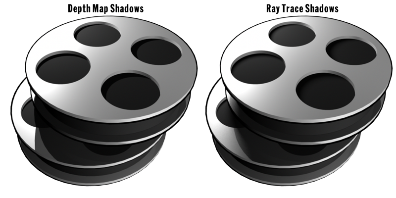Här ser ni skillnaden mellan en ikon som har renderats med Depth Map Shadows kontra en som renderats med Ray Tracing Shadows. Skillnaden är att med Depth Map så reflekteras inte ljusets strålas. Mer raytracing så räknas varje ljusstråle ut som en reflektion från en yta till nästa. Skillnaden är dramatisk, även i renderingtid. Den vänstra tar ungeför två sekunder att rendera, den högra ungefär 14.