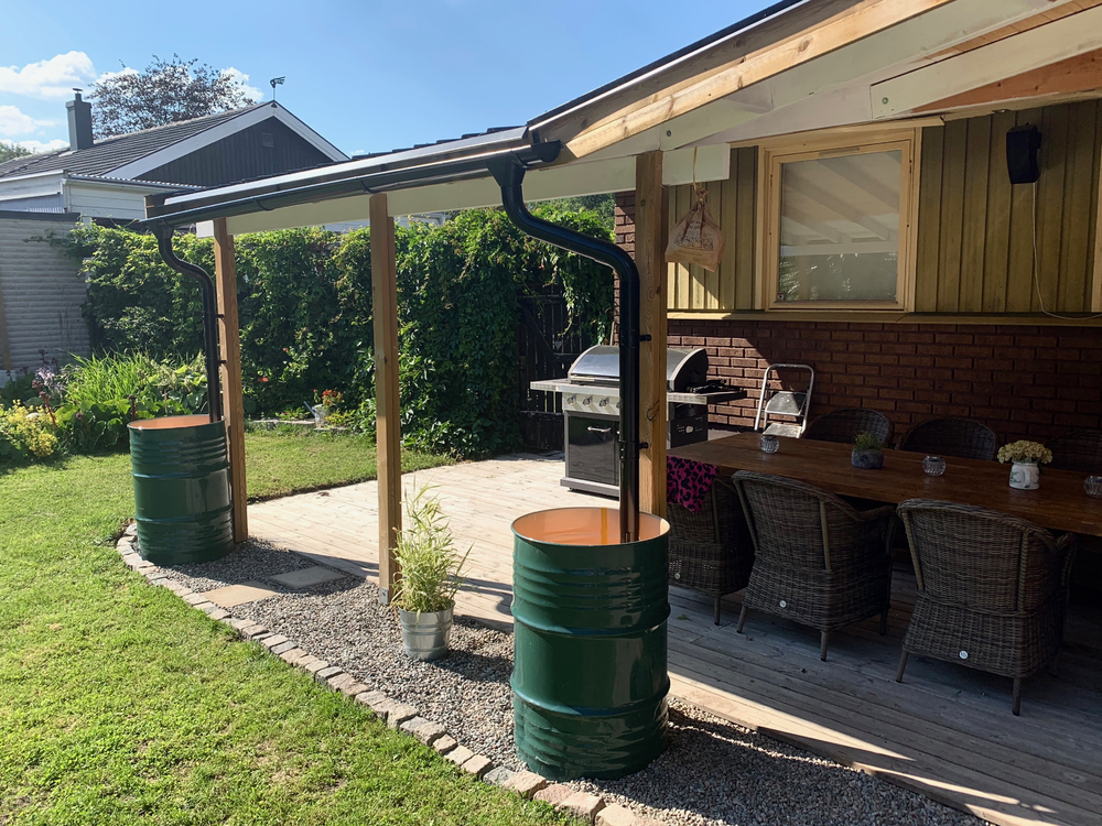 Förra hösten byggde jag tak över uteplatsen på baksidan samt ett nytt bord. Tyvärr så köpte jag hängränna i en storlek som Bauhaus inte längre säljer så att få tag på rätt delar till den var helt omöjligt. Så ny hängränna och stuprör införskaffades och monterades ned i de nya regntunnorna vi köpte för ett par månader sedan. Även marken under grävdes bort och fylldes med grus så det ser rätt så prydligt ut nu