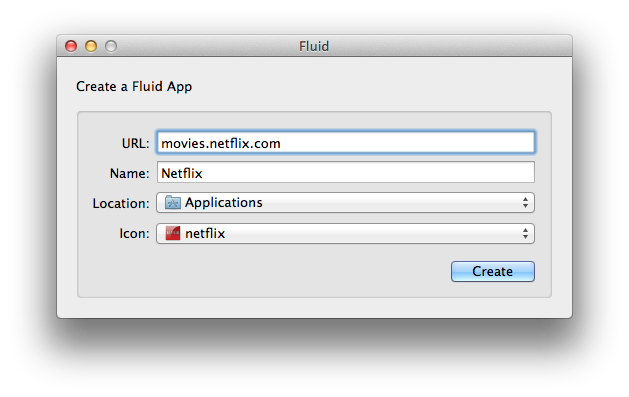 Då ser du detta, där fyller du i "movies.netflix.com" som adress, kallar den Netflix, sparar den i din program-mapp och pang, klart! Om du vill kan du använda bilden till höger som ikon för programmet, annars använder den favico-filen och det ser apa ut.