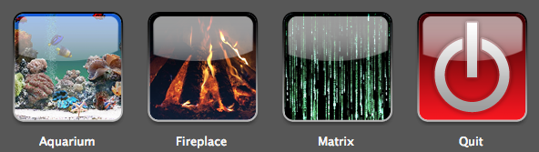 Så, anpassa detta till den skärmsläckare som du vill ska starta. Finns ju ett par som ser ut som en eldstad. Notera att i kommandot att starta skärmsläckaren så är det med "-background", det startar skärmsläckaren i samma "lager" som bakgrundsbilden, så skärmsläckaren ser ut att ligga som bakgrundsbild, vilket är bra i det här syftete eftersom då kan vi öppna saker över den, plus att den inte avaktiveras så fort vi rör musen eller något annat. Vi kan alltså aktivera Dashboard över skärmsläckaren och den fortsätter i bakgrunden. Snyggt!
