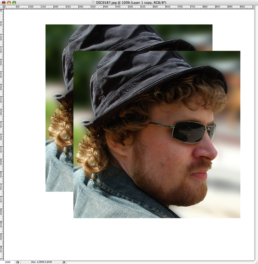 Lägg bilden på ett eget lager, utöka Canvas (Image->Canvas Size...) med 150% åt båda hållen. Lägg originalbilden lite i överkant och duplicera det lagret så vi har två likadana lager.