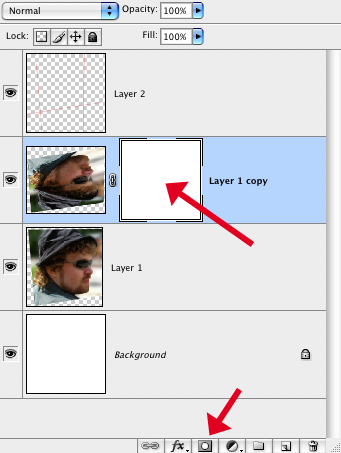 Sen går du till lagerpaletten och klickar på den lilla "Add layer mask"-knappen. Då skapas en lagermask och det är den vi ska använda för att fade:a ut bilden.