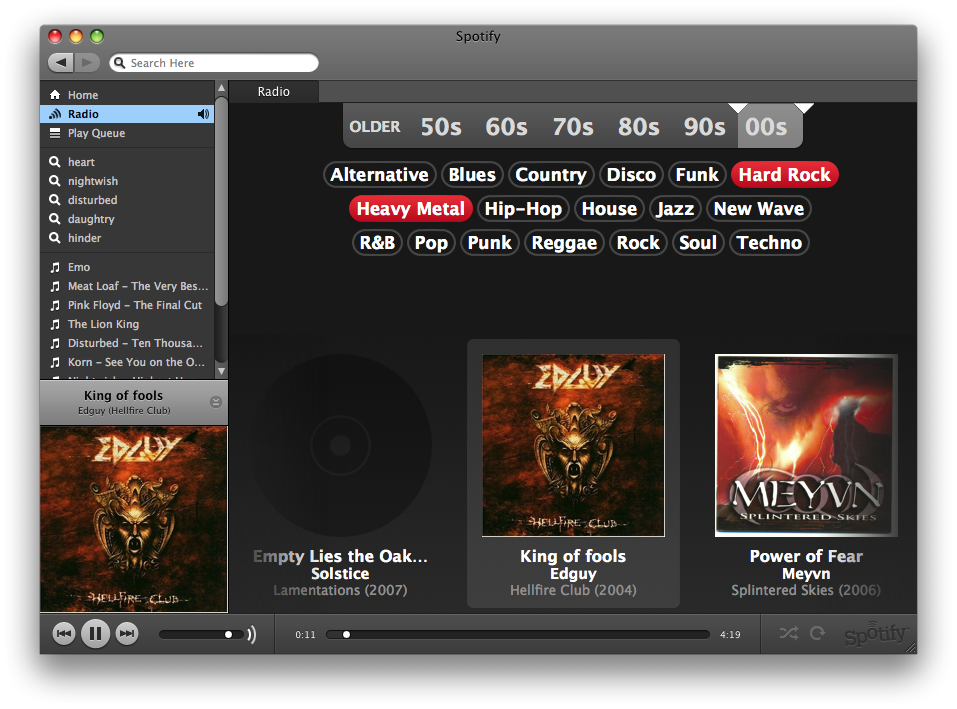 Men den fränaste funktionen är att man kan slå på "radion" i Spotify, och bestämma att man vill lyssna på "Hard Rock" och "Heavy Metal" från 2000-talet, eller varför inte Blues mellan 1950-1970? Sen matas det bara med ny musik hela tiden. Gillar man inte en viss låt så går man bara förbi den och fortsätter med nästa.
