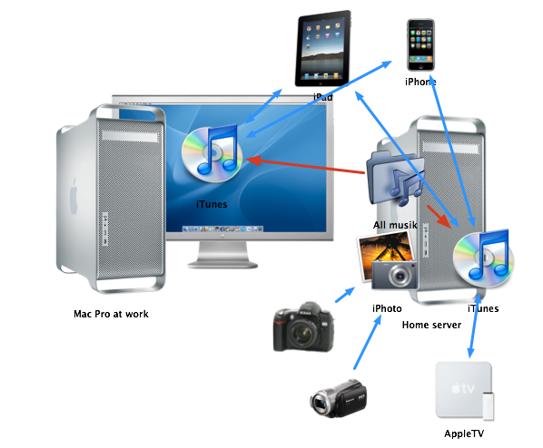Så detta är ganska mycket min setup nu. Jag har all min musik (ca 60 GB) och alla mina bilder (över 20k fotografier) på min Macbook Pro och detta är min Digital Hub. Alla de blå linjerna är apparater som jag synkronisera eller importerar till min laptop. Detta är en jättebra lösning eftersom jag har alla mina media med mig, och jag kan sitta i soffan hemma och redigera hemfilmer (vilket jag aldrig gör, men jag kan). Den röda linjen som går från iTunes till min Mac Pro i arbetet är den inbyggda delningsfunktion i iTunes som visar min laptop i iTunes på min Mac Pro och jag kan lyssna på musik (men inte redigera spellistor och liknande).