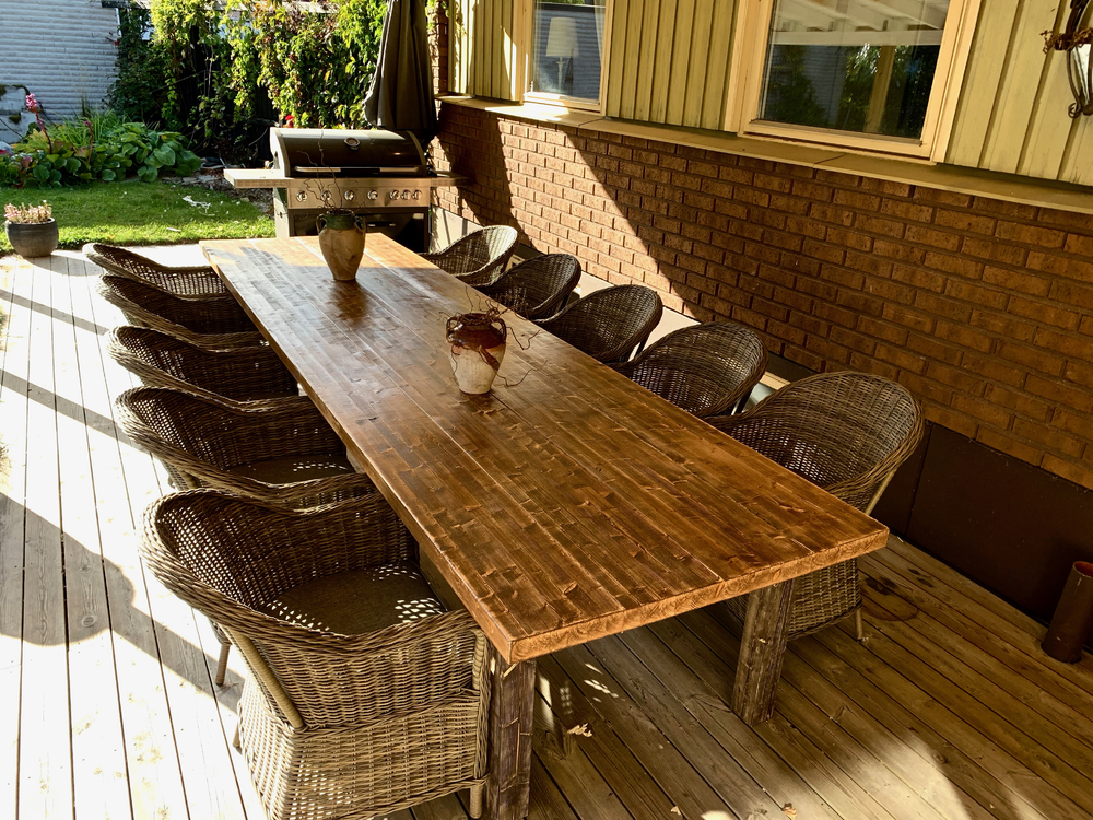 Under det nya altantaket jag byggde i höstas så behövde vi ett nytt bord, så vi köpte tio nya stolar i sådan där konstrotting och så satte jag igång och byggde ett stort bord där många ryms runt. Jag valde att köpa limträbalk och använda dominos för att sätta ihop dem till en stor skiva. Limträbalk är ju rätt så formstabilt vilket var tanken.