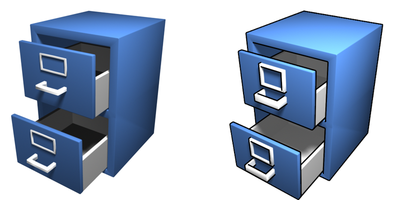 Och för er som läste aritkeln om Upplösningsoberoende, vilket förmodligen inte var någon, men ändå, så såg ni att något som skilde den nya från den gamla var att den äldre hade ett lite mer stilistiskt utseende, och det är ju lite av en fallgrop när man renderar ut ikoner på 512x512 pixlar. Dom är otroligt stora och tydliga och den tydligheten kanske inte håller hela vägen ned i de mindre storlekarna, så man måste öka profilerna, sätta på konturer och sådant. Som tur är så har Maya detta inbyggt och "tecknade" konturer kan man bara sätta på ett objekt och bestämma hur dom ska fungera. Med den nya renderingen så är kanterna tydligare och den blir inte lika grötig när den blir mindre.