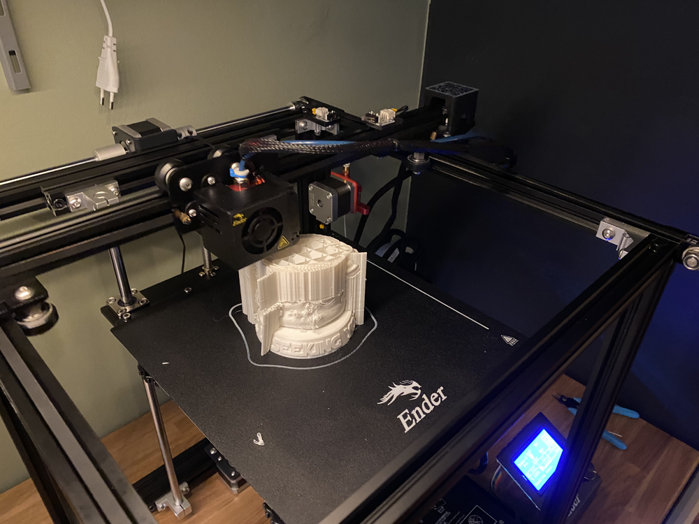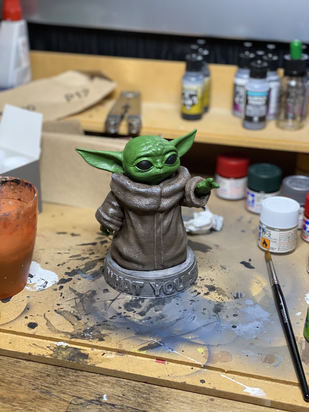 Jag blev imponerad av kvalitén på den, blev riktigt bra, så det övertalade mig att skaffa en 3D-skrivare. Efter en testutskrift av en liten kub så skrev jag ut Baby Yoda från Mandalorian.