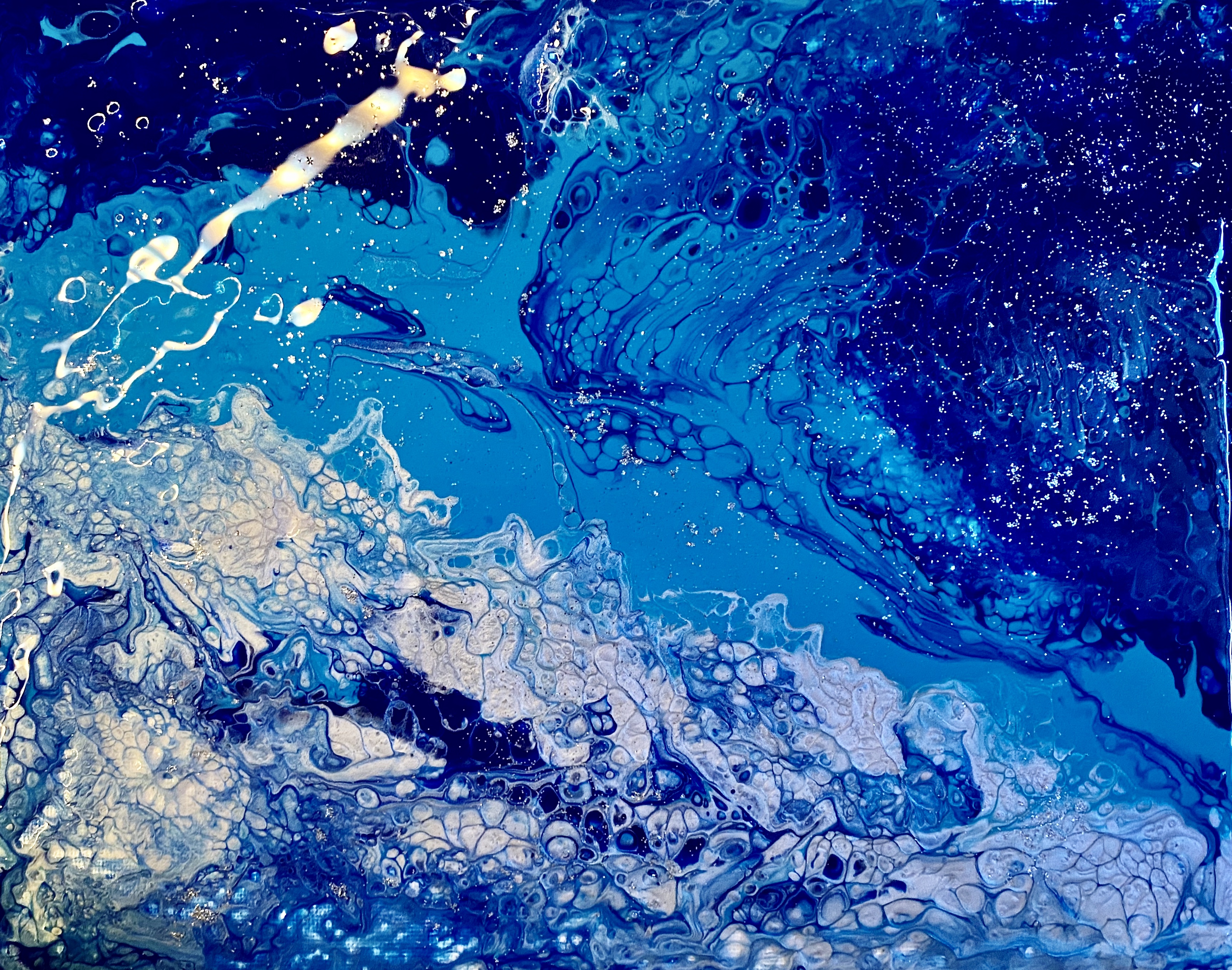Testar en teknik där man häller upp akrylfärg i en kopp, droppar i lite silikonolja och sen rör om, sedan häller man flera sådana olika färger på en canvas och ser hur oljan får akrylen att blandas på lite intressanta sätt
