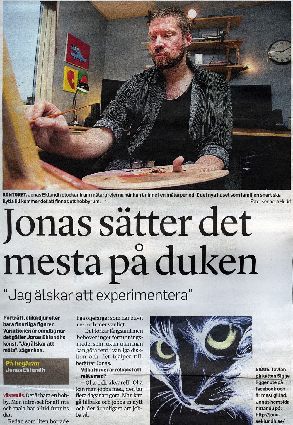 Idag är jag med i VLT, under rubriken "Jonas sätter det mesta på duken". Jätteskoj att vara med! Dom kom hem och fotade lite hemma medan jag målade och fotografen var mest upptagen av vår katt Sigge.