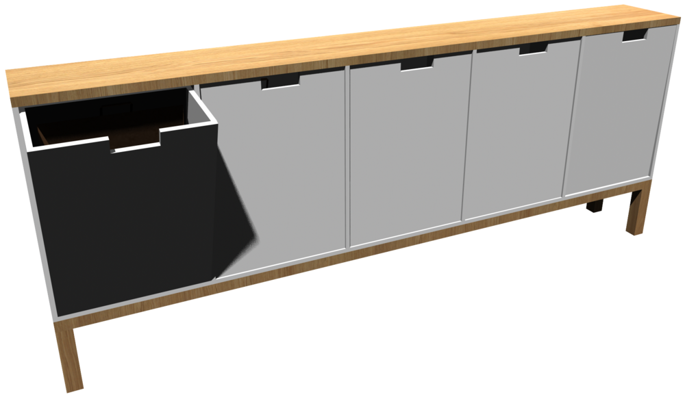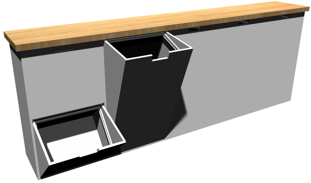 Men idén är bra, och det vore nice med en möbel som tar mindre plats i groventrén så jag designade om den igen. Den här gången med lådor som alla vinklas ut, och plats för alla olika typer av återvinning.