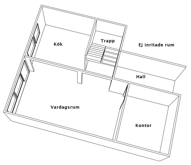 Så här ser vårt hus ut, nästan. Det intressanta här är alltså att köket och vardagsrummet sitter ihop i ett "L" vilket gör det himla öppet och luftigt, men också att vi har rätt få väggar, och ingen att sätta upp en TV på.
