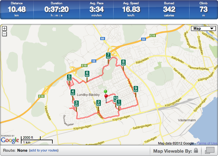 Om vädret tillåter så tänker jag cykla också. Jag har fixat RunKeeper till iPhonen och kan följa min framfart. Testade det idag och det funkar bra. Jag cyklade en mil på 34 minuter och det kändes bra. Jag tänkte cykla en till två gånger i veckan beroende på hur jag kommer iväg att simma. Sammanlagt högst tre gånger i veckan ska jag simma eller cykla är tanken.