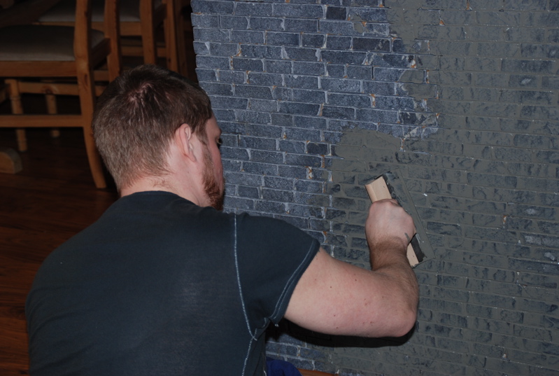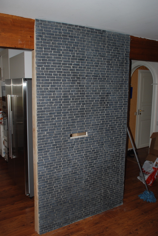 Vilket slit! Att foga den här väggen tog lätt fyra-fem timmar totalt. Eftersom det är mosaik-kakel så finns det hur mycket springor som helst, och alla är olika stora och man måste in och kolla hur fogen har lagt sig i varje springa. Ett sådant pill. Och sen måste man skynda sig så man hinner torka bort det ordentligt. Men nu är det klart! Skönt!