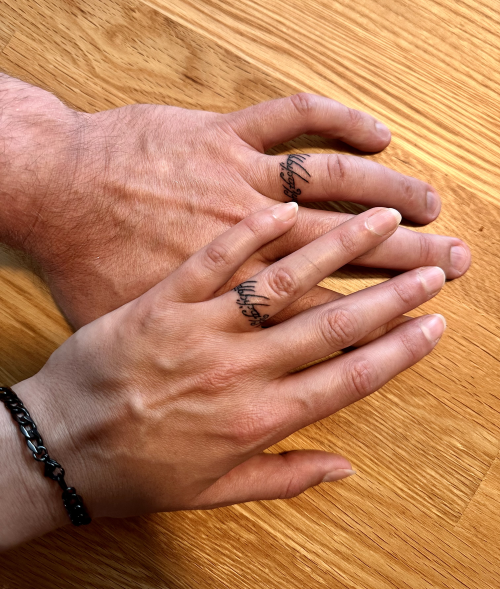 Tatueringar på fingrar och händer håller sällan länge så vi får se hur det blir. Men det är ju en förlovning, och när vi gifter oss så blir det ringar över dessa vilket också är passande då inskriptionen blir på insidan av ringen så klart.