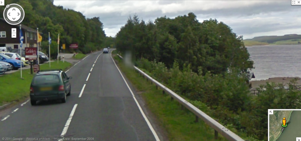 Jag sökte givetvis upp stället på Google Maps, men dom har nu tagit bort The Stig! Dom har helt enkelt blurrat ut honom helt ur bilden, inte bara ansiktet som dom gör automatiskt, någon har i efterhand gått in och tagit bort honom med blurfiltret i Photoshop (typ).