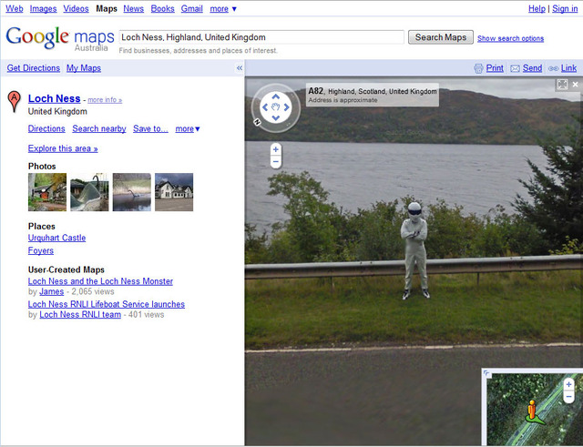 Någon hittade en cameo av Top Gears "The Stig" på en Google Streetview-bild vid Loch Ness i England. När Streetview-bilen åkte förbi stod han vid vägkanten och photobombade helt enkelt.