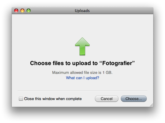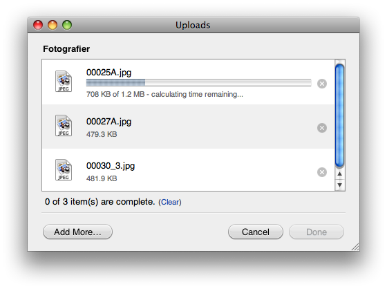 Detta är Apples, där man klickar på pilen och sen kan man i filväljare välja flera bilder åt gången och sedan så laddas dom upp en efter en. Riktigt smidigt (kanske inte fullt så smidigt som jag gör det i Atlas, men det är en annan historia).