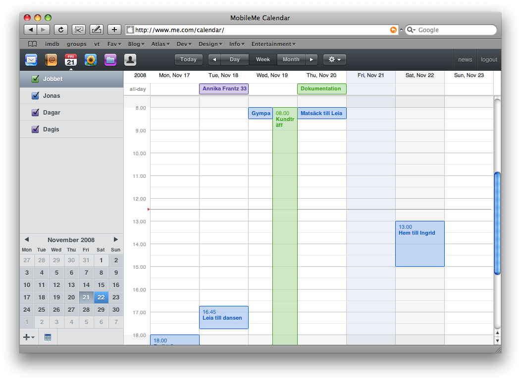 Kalender-gränssnitten. Återigen, Google är bra mycket mer avancerade, men oj vad snyggare och trevligare det är att jobba i MobileMe.