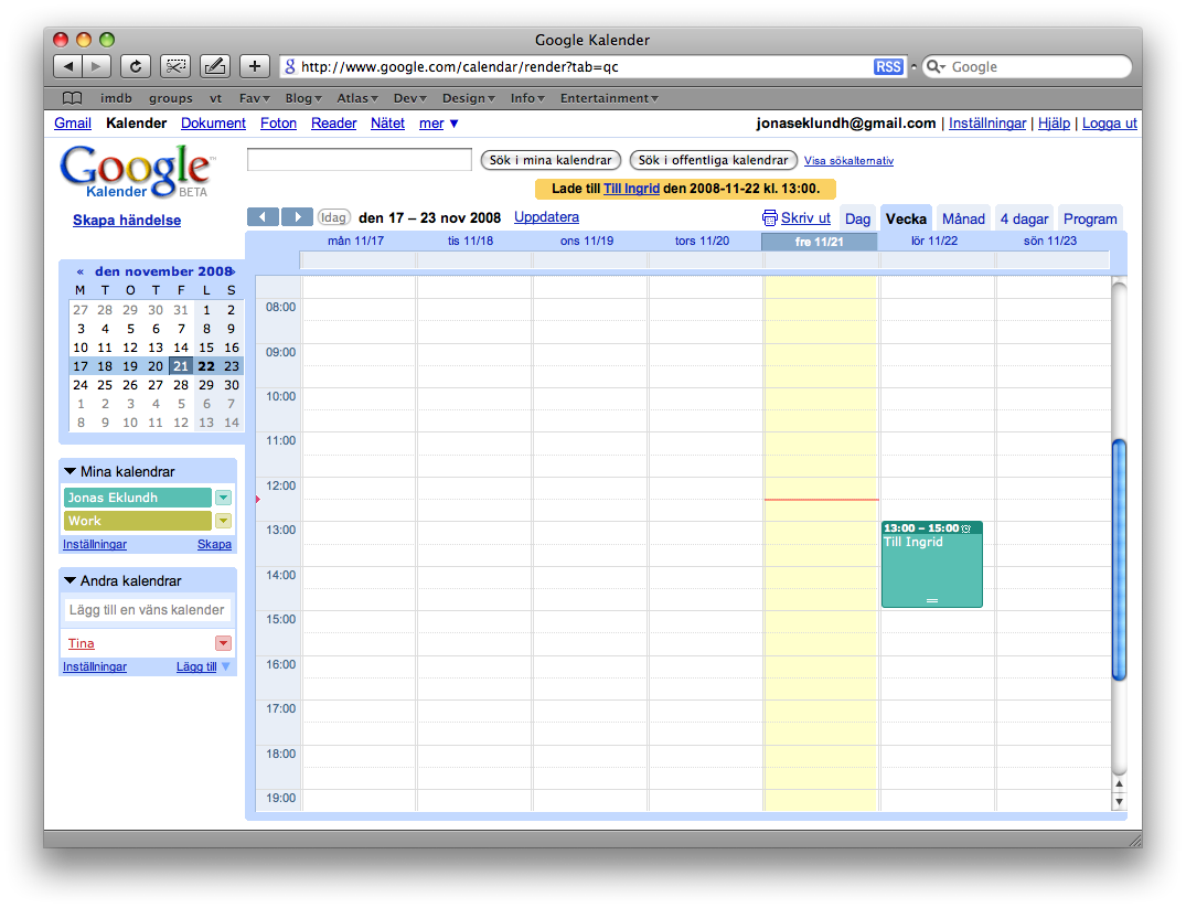 Google lanserade nyligen "themes" för Gmail så man kan förändra utseendet, och det blev genast bättre, även om det inte direkt blev bra. Jag valde det temat som såg mest ut som en riktigt applikation (Shiny) och sen jämförde jag lite mellan Google och Mobile Me. Men innan jag börjar så vill jag nämna att jag är väl medveten om att Google applikationer i regel har mer funktioner än Apples. Men samtidigt så är det ju så att saker som att du kommer åt dina picasa-album från din google-blog jämförbart med att du lätt kommer åt dina iPhoto-bilder från iWeb. Men saker som grupp-kalendrar är sådant som saknas i Apples applikationer. Klicka på bilderna för att se dem i större storlek