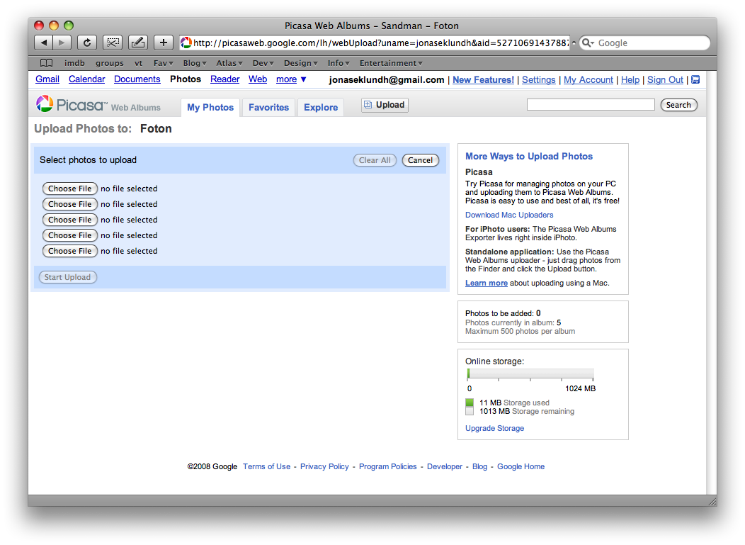 Detta var värt att nämna också - så här ser det ut när man laddar upp bilder i Picasa, det är fem åt gången som mest och man får välja varje en och en. Det finns givetvis desktop-applikationer för att ladda upp fler åt gången på ett smidigare sätt, men detta är alltså webgränssnittet. Det är ändå viktigt för det är via det här gränssnittet man laddar upp när man inte har desktop-applikationen tillgänglig. Hemma hos kompisar, på resan och så vidare.
