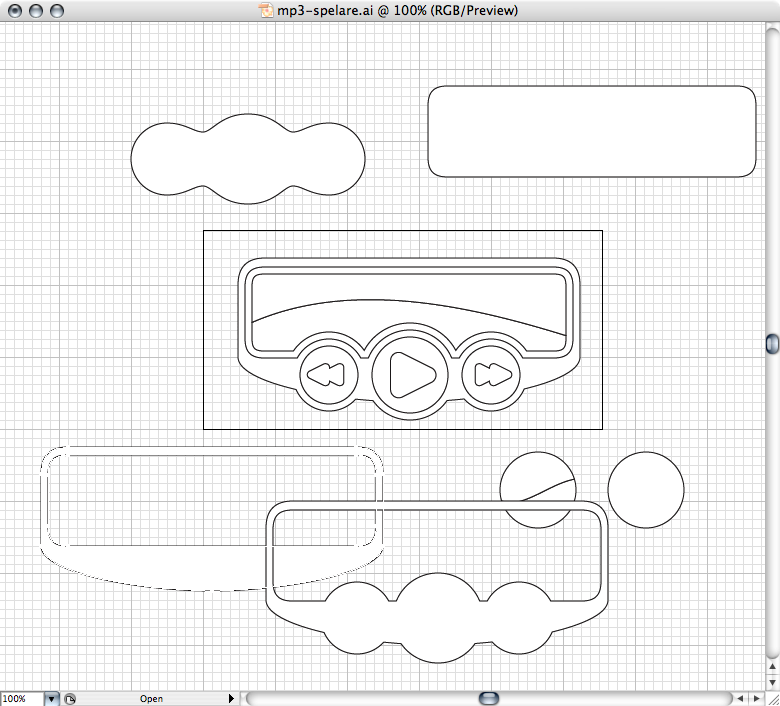 Vi börjar i Illustrator och skapar primärobjekten, vilket kort och gott är de olika former vi kommer arbeta med för att skapa gränssnittet. Med illustrationsverktygen är det enkelt at skapa vackra former med bezierkurvor (se bilden, formen längst ner till höger gar små "handtag", vilket är knutna till dess bezierkurva)