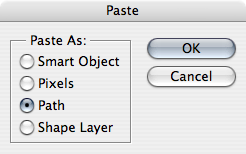 Nästa steg är att kopiera ett objekt in i klippminnet och gå över till PhotoShop där vi skapat en canvas som rymmer vår mp3-spelare. När vi väljer klsitra in där så kommer dne här dialogrutan upp. Välj "Paste as Shape Layer" för varje objekt.