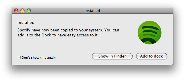 Och när du är klar så kommer detta upp, som visar att den är installerad och ger dig möjlighet att lägga till den i dockan eller visa den i Findern.