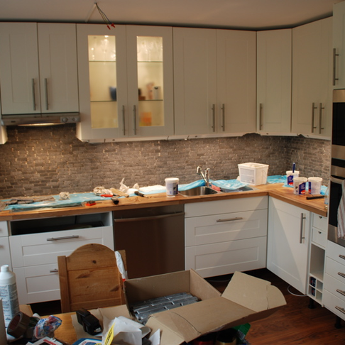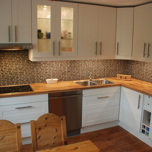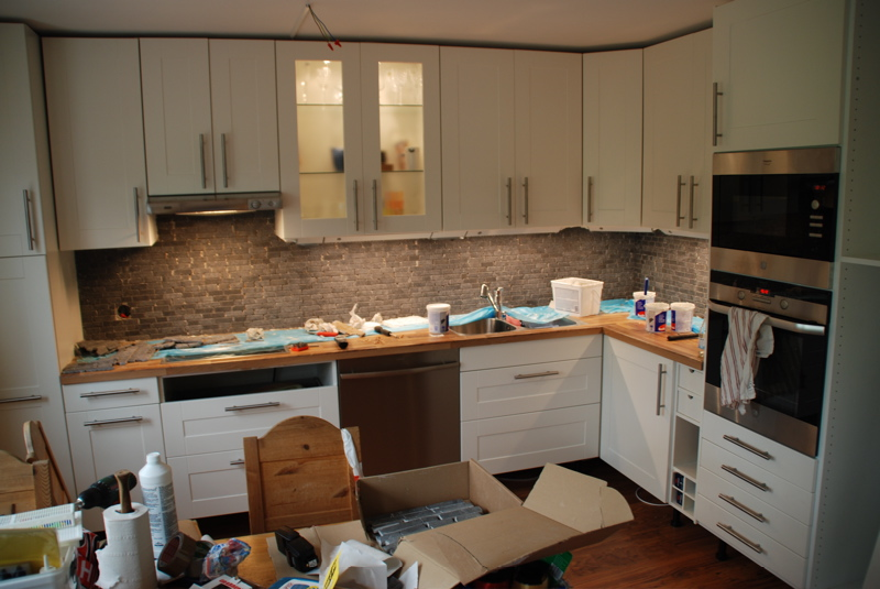 Men kolla så fint det blev! Det är alltså inte fogat och klart ännu, men det är på väg! Jämför gärna med den photoshop-fejk-bild jag lade upp här. Rätt så likt va? Nåja, lite i alla fall. Sen var jag även iväg och inhandlade ett till högskåp som ska stå mellan kylen och ugnen. Så nu är hela den nya väggen inredd så att säga. Det blir ruskigt bra, och köket känns så mycket större. Fantastiskt bra!