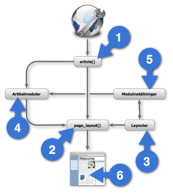 Och så här ska det hela vara ihopbyggt. När man besöker en artikelsida så anropas funktionerna på det här viset