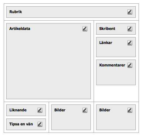 Men så vill jag inte ha det. Kunden ska kunna bestämma layout med mycket större frihet än så. Kunna flytta artikelmodulen, förändra kolumnstorlekar, lägga till kolumner, lägga till rader. Kolla på bilden till höger så ser du hur det kan tänkas se ut. Kunden ska kunna klicka på redigera-ikon för varje modul för att skapa specifika inställningar för den modulen. Sen ska man kunna spara layouten till artikeln, artikelkategorin eller globalt.