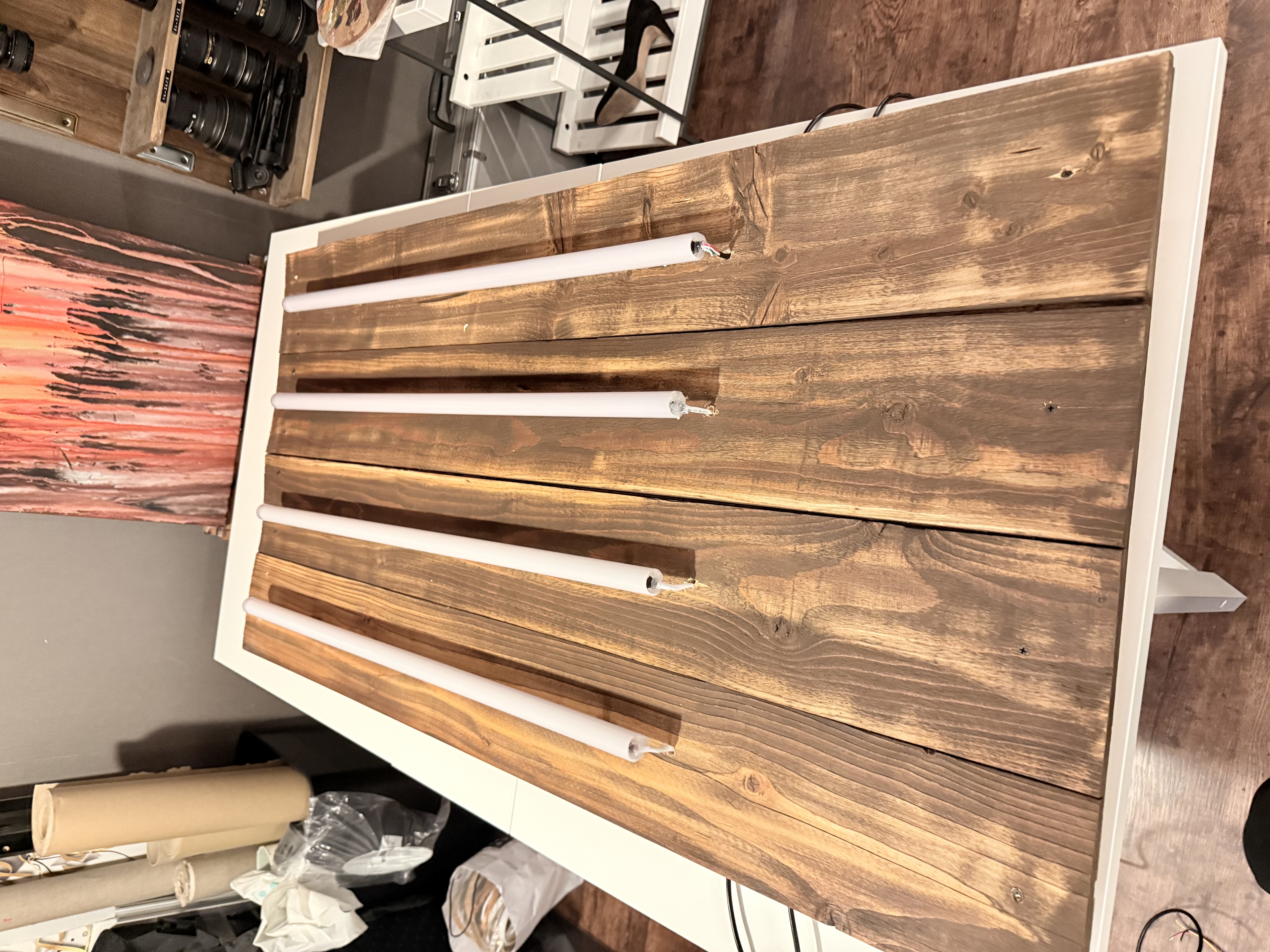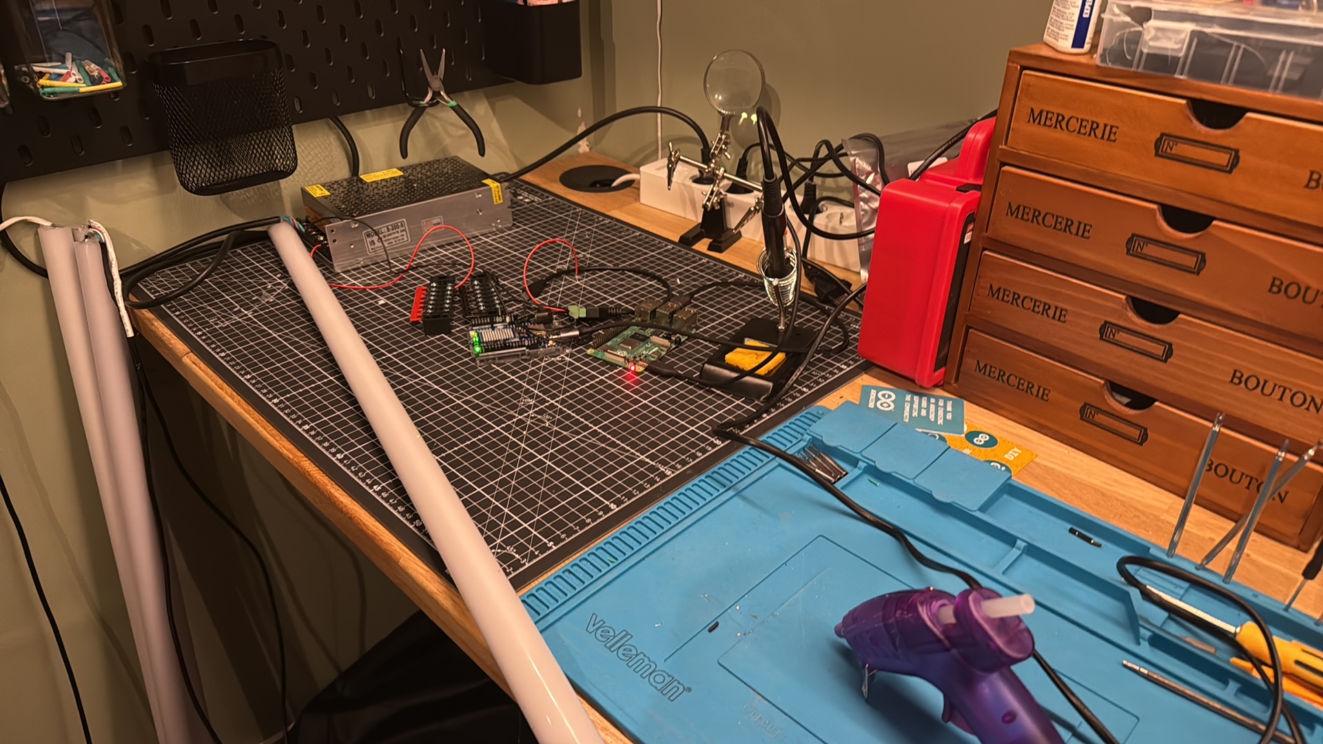 Status just nu är att alla fyra rören med led-lister är monterade på en skiva tillsammans med de fyra handtagen. Nästa steg är att monter all elektronik bakom den här skivan och sedan programmera allt så det funkar som det är tänkt. Så det kommer komma fler uppdateringar, förhoppningsvis när det väl är klart!