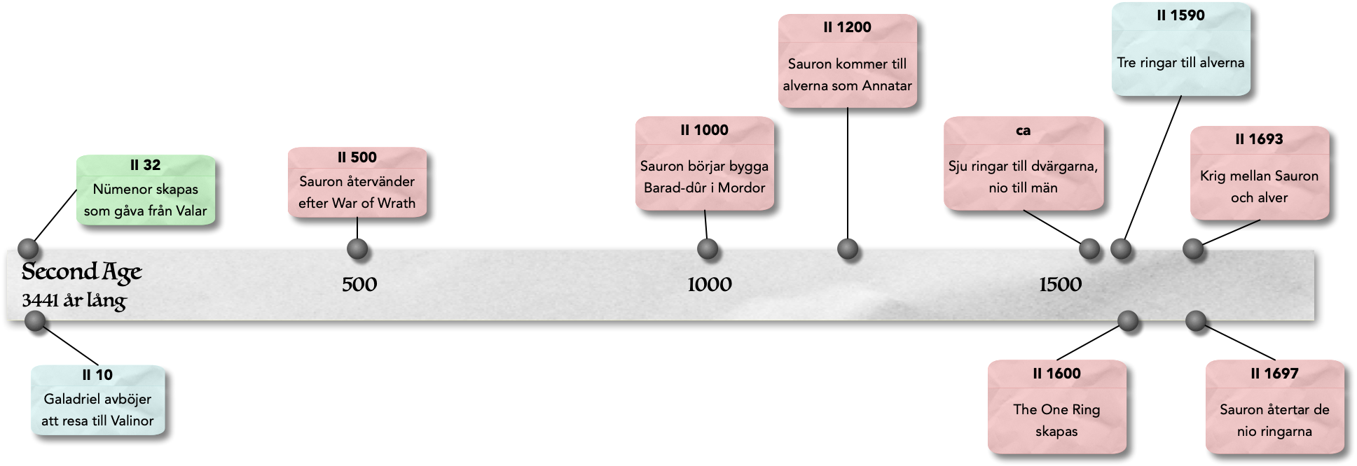 För enkelhetens skulle har jag delat upp andra tidsåldern i två halvor då den är 3 441 år lång. I första halvan så skapas Nümenor som en gåva från Valar. Galadriels födelse är inte med i första tidsåldern för hon är äldre än historien i Middle Earth och föddes i en tidsålder som kallas "Years of the Trees"
