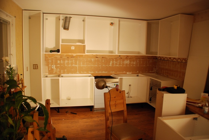 Det tog ungefär två dagar, men nu är skåpen på plats. Det tog så pass lång tid eftersom när vi kom fram till väggen så insåg vi att vi hade 10 cm över, så vi hade kunnat ha 40cm-skåp istället för dom 30cm-skåp vi hade tagit "för säkerhets skull". Men om vi kunde ha 40cm så var allt så mycket bättre. Iväg till IKEA och inhandla nya stommar!