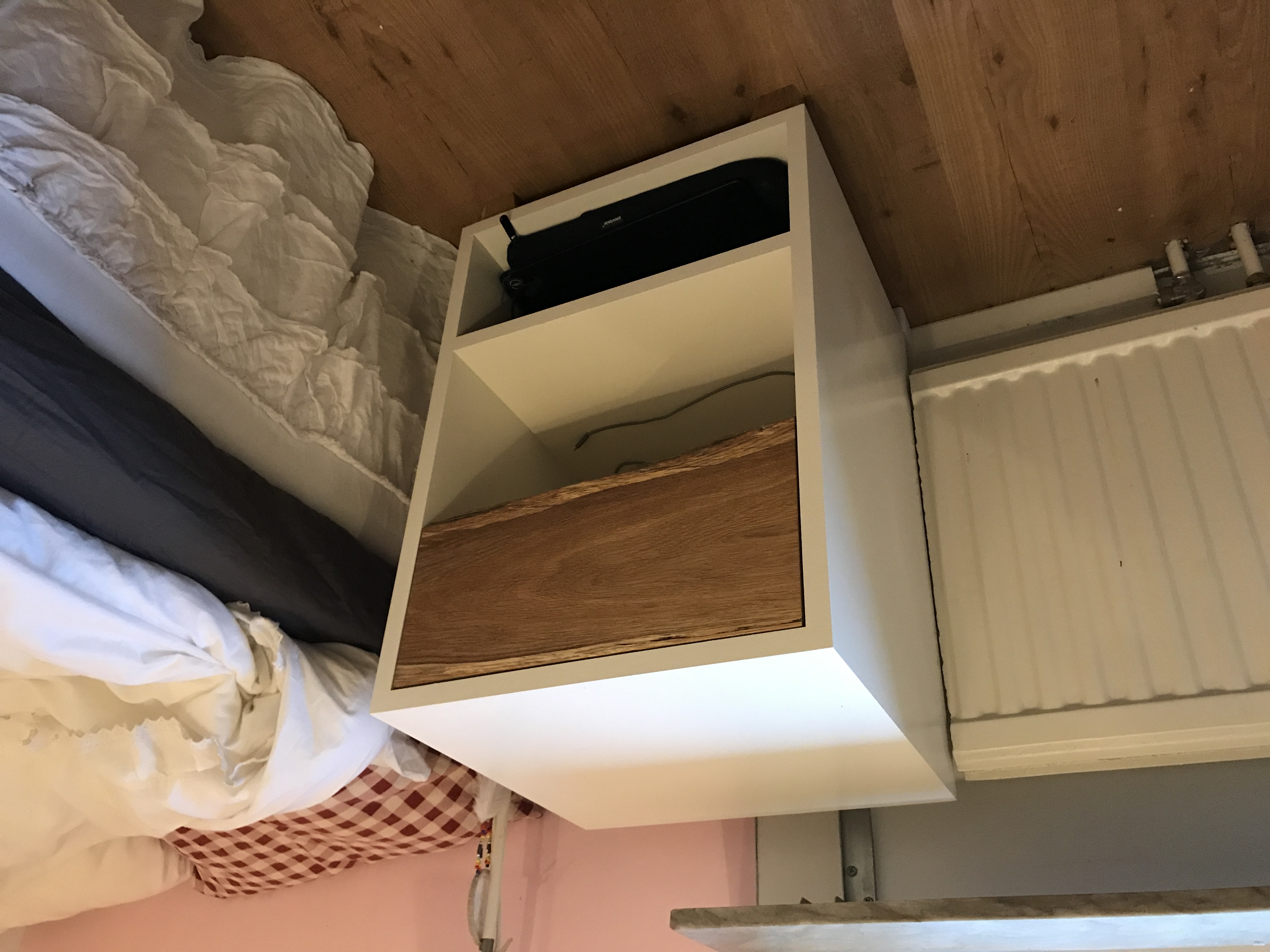 Min dotter har sagt att hon vill ha ett nytt nattduksbord, och jag såg en design jag gillade så jag gjorde en liknande lösning. Den är byggd i MDF och med en "live edge" ekskiva som lådfront. Jag ville måla den ljusgrå men hon ville ha den vit, så det fick bli vitt.